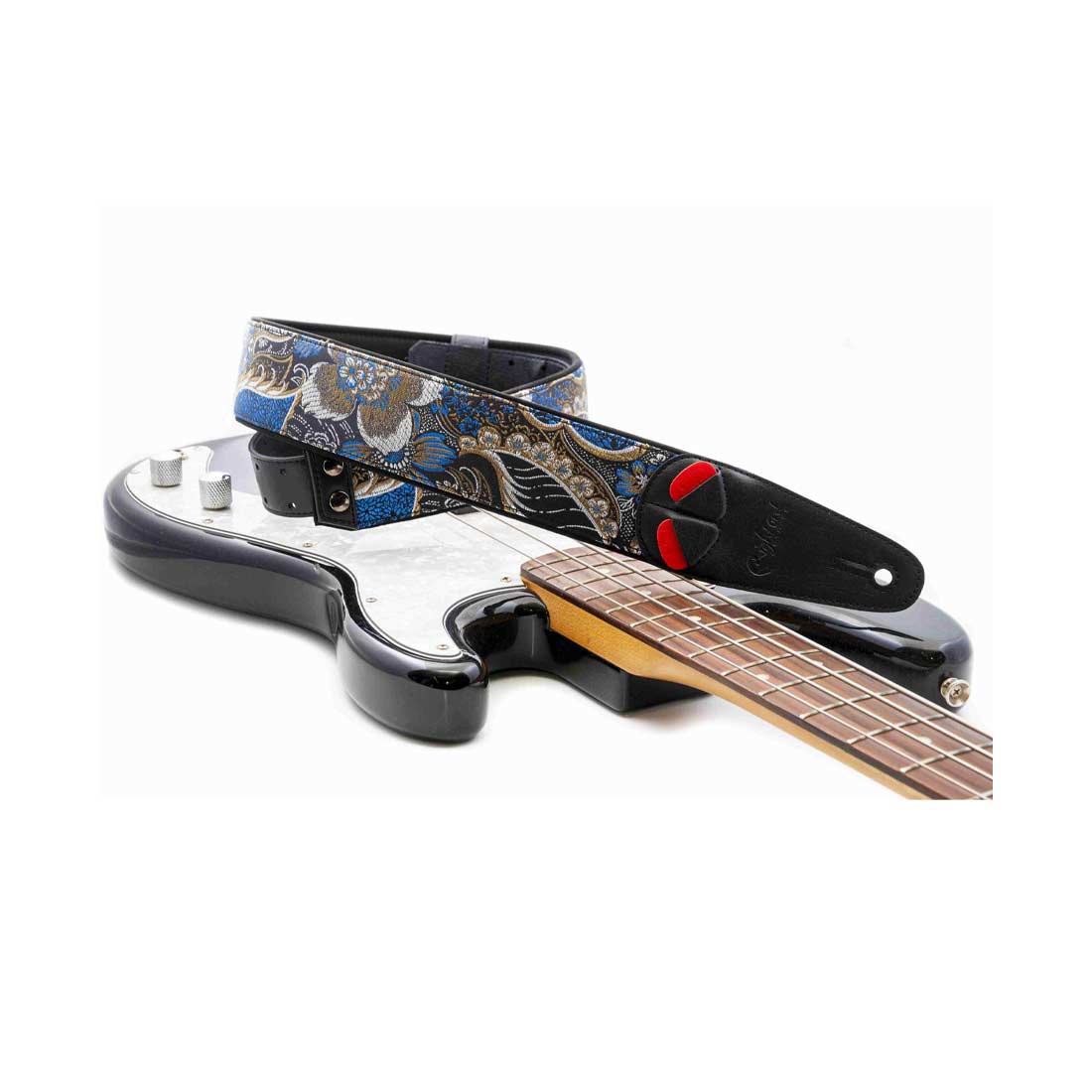 Pick Holder located in the tail of the strap. They are 3 simple cuts to introduce the plectrums, allowing faster and more intuitive access to them.
